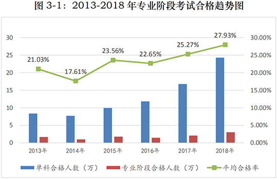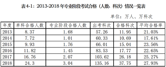 按照合格科次與出考科次的比值測算,2018 年專業(yè)階段考試 6 個科目的平均合格率為 27.93%,約有 24.30 萬人取得至少 1個科目的單科合格成績,比2017年增加了7.54萬人,增幅44.97%。總合格科次為 37.75 萬,比 2017年增加了 11.57萬,增幅 44.19%。有 3.04 萬人累計通過專業(yè)階段 6 科考試,取得專業(yè)階段考試合格證書,比 2017 年增加了 9 713 人,增幅 46.88%。2018 年一次性通過專業(yè)階段 6 科考試的有 363 人,比 2017 年增加了 117 人。