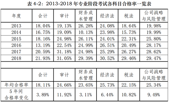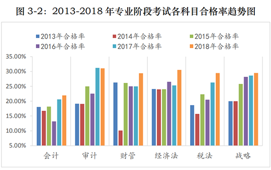 2013-2018 年,專業(yè)階段考試的 6 個科目的單科合格率均不同程度上升。其中,“審計”、“稅法”、“公司戰(zhàn)略與風(fēng)險管理”3個科目的單科合格率總體上升趨勢較為明顯。5 年間,“審計”的單科合格率提高了 11.92%,“稅法”的單科合格率提高了10.82%,“公司戰(zhàn)略與風(fēng)險管理”的單科合格率提高了 9.49%。而“會計”的年均合格率相對最低,僅為 18.11%;“經(jīng)濟(jì)法”的年均合格率相對較高,為 25.73%。