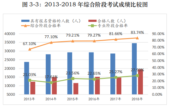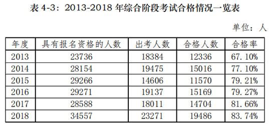 2018年有19 486人通過綜合階段考試并取得全科合格證書,按照合格人數(shù)與出考人數(shù)的比值測算,合格率為 83.74%。