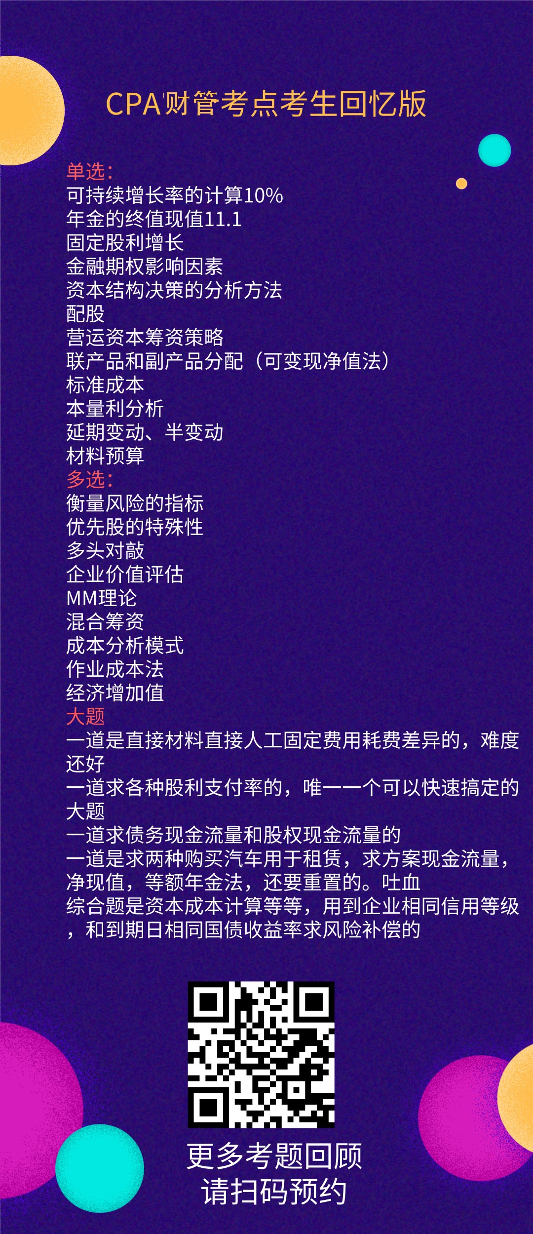 瑩櫻:有沒(méi)有人對(duì)答案,心態(tài)有點(diǎn)崩,收購(gòu)那道計(jì)算題幾乎整道題放棄了。買(mǎi)車(chē)出租那道題兩個(gè)等額年金一個(gè)77.2(還是77.6來(lái)著),另一個(gè)80多,股利那道分別是28%/30%/60%/30%,標(biāo)準(zhǔn)成本一個(gè)660多,一個(gè)700多,綜合題……剩下記不住了(小編佩服)
