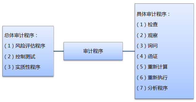 審計(jì)程序可分為總體審計(jì)程序(三個(gè)大程序)、具體審計(jì)程序(七個(gè)小程序)。