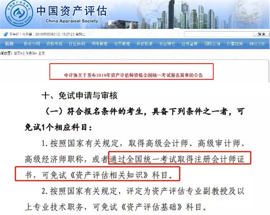 《中評(píng)協(xié)關(guān)于發(fā)布2019年資產(chǎn)評(píng)估師資格全國統(tǒng)一考試報(bào)名簡章的公告》中有一條免試信息:通過全國統(tǒng)一考試取得注冊(cè)會(huì)計(jì)師證書,可免試《資產(chǎn)評(píng)估相關(guān)知識(shí)》科目。要注意的是,這次免試是純屬單向免試,不是“互免”。