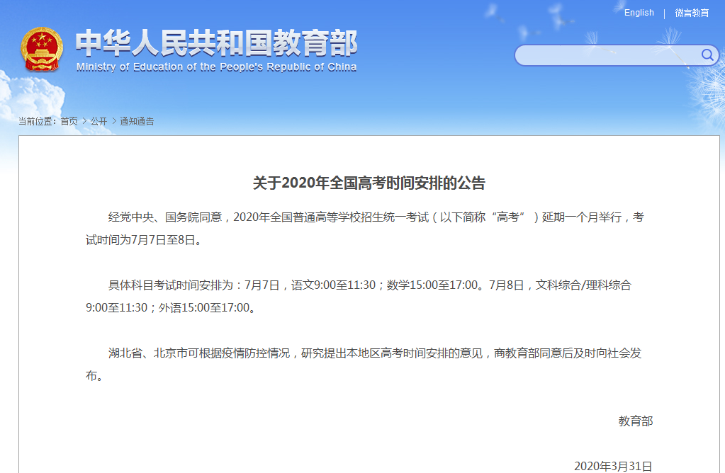 剛剛!教育部宣布:今年高考時間推遲一個月!