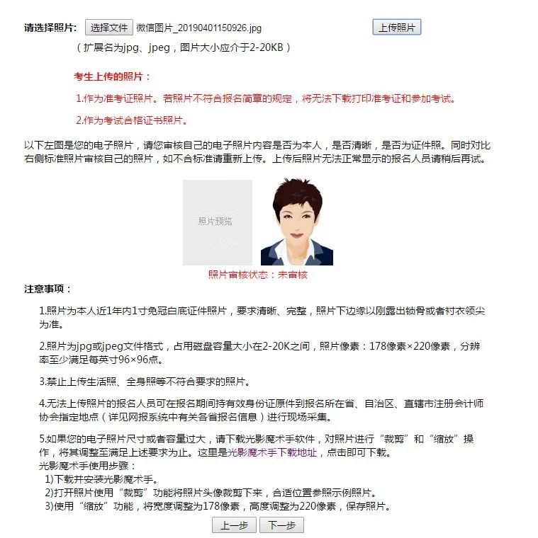 第一個原因是中注協(xié)大大的系統(tǒng)問題,除了更換瀏覽器或者是錯峰上傳的話,沒有其他辦法。第二個原因呢,大家一定要選擇官方要求的照片,本人近1年內(nèi)1寸免冠白底證件照,jpg或者是jpeg格式,大小在2—20K之間,像素178×220。