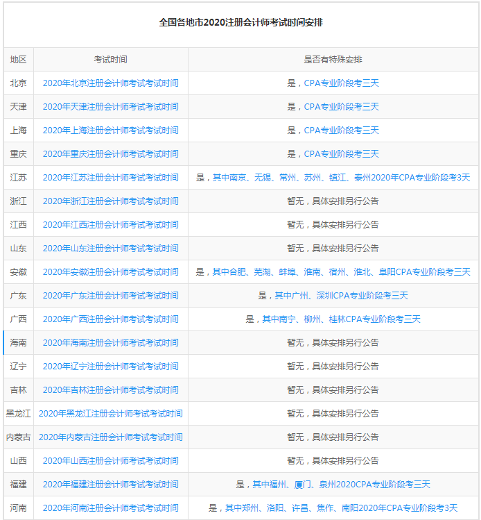 2020年注冊會計師考試時間已經公布,但由于注會報名人數(shù)近幾年一直呈現(xiàn)一個較為高速的增長趨勢,所以在中注協(xié)公布的報名簡章中,可以看到2020年注會專業(yè)階段考試時間發(fā)生了較大的變化。@所有注會考生,這些城市2020CPA專業(yè)階段考三天!<<<任何CPA相關問題點我咨詢