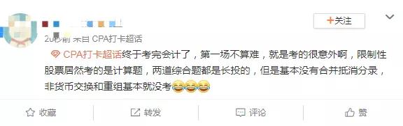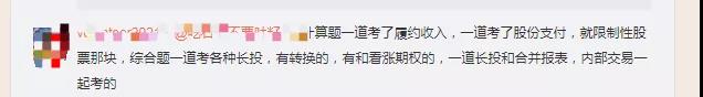 根據(jù)剛出考場(chǎng)的同學(xué)反饋到,感覺(jué)考試難度還好!也有一部分同學(xué)分享考到了股份支付、收入、合并報(bào)表、長(zhǎng)投、金融資產(chǎn)這些知識(shí)點(diǎn)~