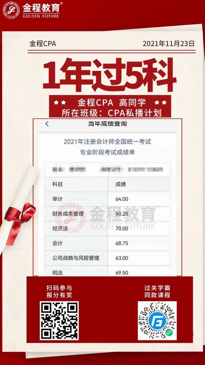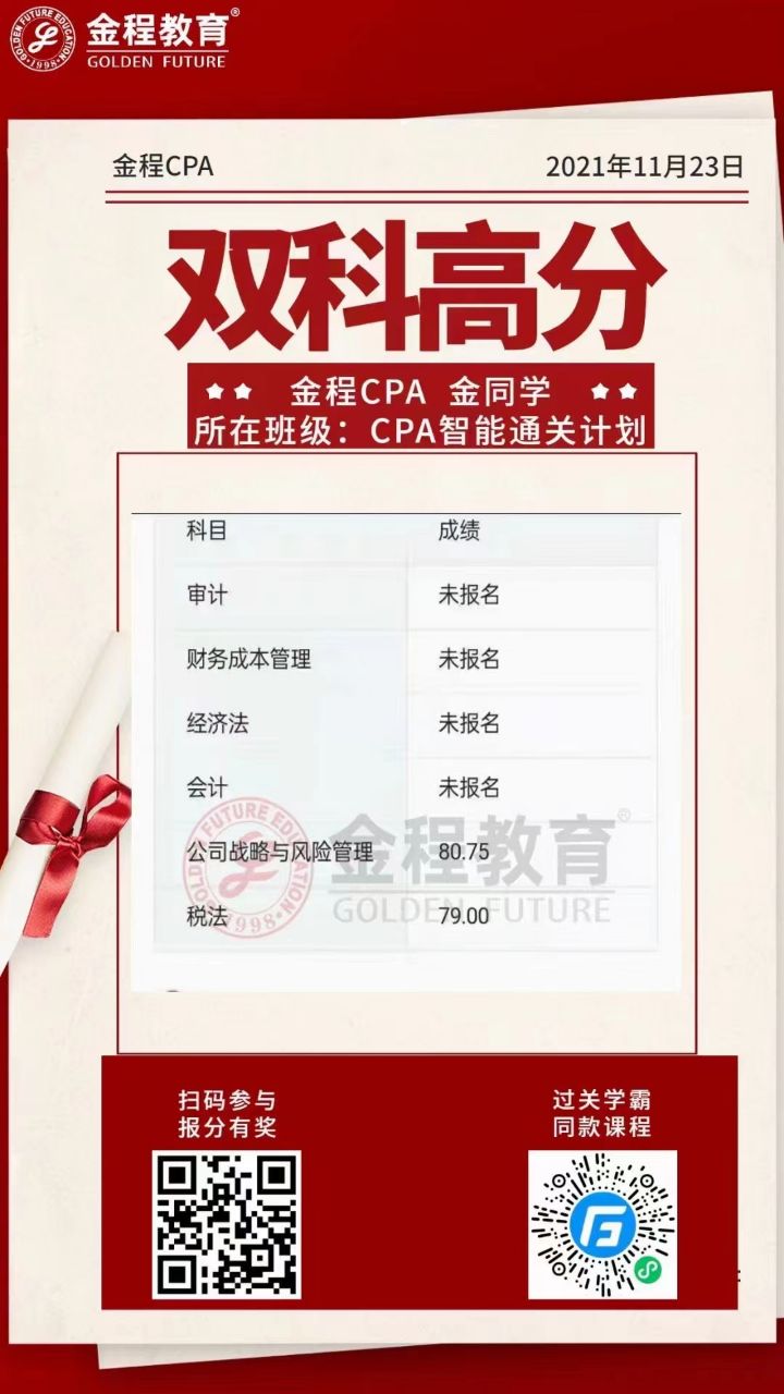 查詢完2021年CPA成績(jī),小伙伴們2022年備考可以提上日程了。以下是2021年金程學(xué)霸成績(jī)單,一起來沾沾喜氣,為2022年的我們加油吧!