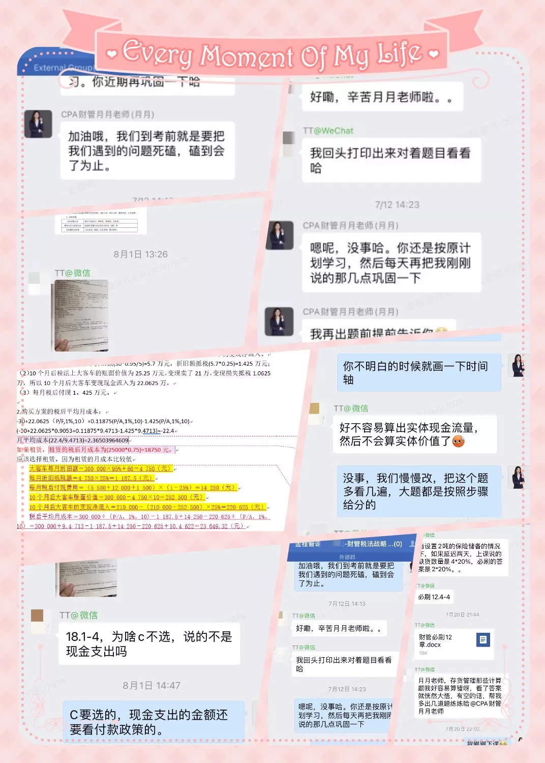 另外,財管是VIP月月老師帶的,因材施教,受益匪淺,否則我感覺我應(yīng)該會死在財管上。我認為財管是最有必要好好聽錄播課和直播課的學(xué)科,每一次聽錄播課總有豁然開朗的感覺!后期沒有很多時間聽直播課,但感覺直播課能讓人真正回到上學(xué)時期的狀態(tài)。