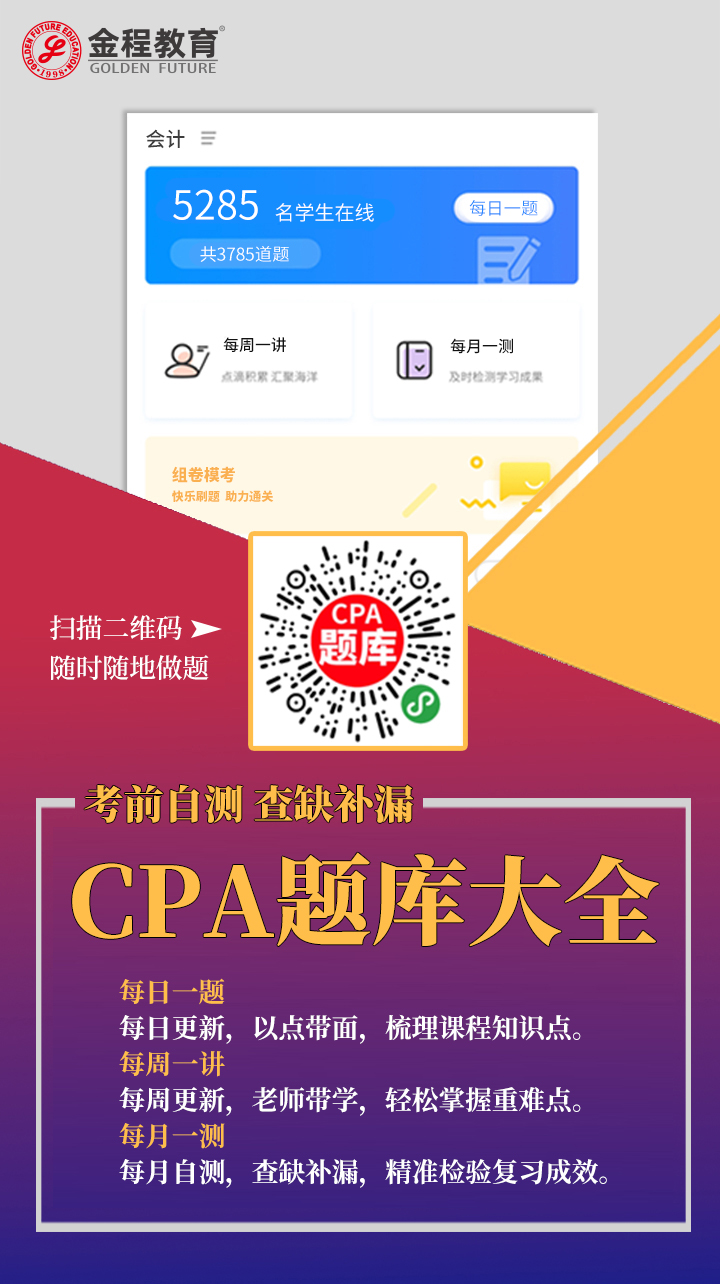 ① 歡迎關(guān)注微信公眾號(hào)“金程CPA”,獲取更多最新資訊和干貨。關(guān)注收藏微信小程序“CPA題庫(kù)大全”隨時(shí)隨地在線做題,查缺補(bǔ)漏!