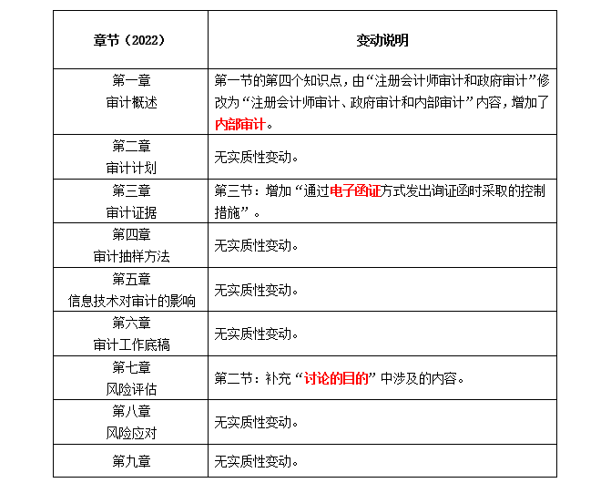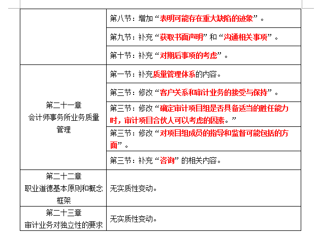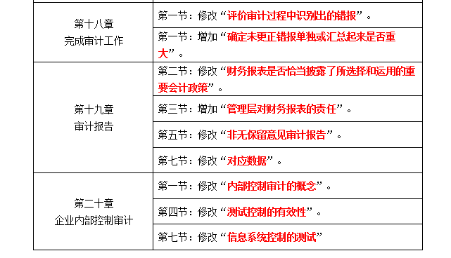 2.大篇幅重新編寫:“第十九章審計報告”、“第二十章企業(yè)內(nèi)部控制審計”、“第二十一章會計師事務所業(yè)務質(zhì)量管理”,以上三章涉及大篇幅重新編寫。