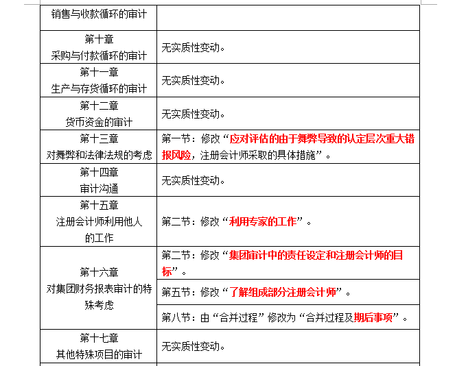 1.重要考點的變動:“第三章審計證據(jù)”、“第十三章對舞弊和法律法規(guī)的考慮”、“第十六章對集團財務報表的特殊考慮”、“第十八章完成審計工作”,以上四章中涉及個別重要考點的變動。