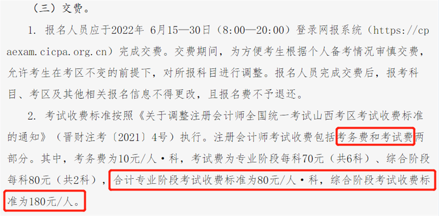 山西考區(qū):專業(yè)階段80元/科,綜合階段報名費180元