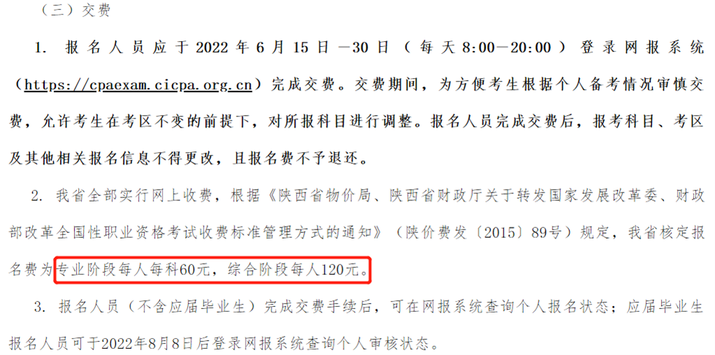 陜西考區(qū):專業(yè)階段60元/科,綜合階段報名費120元