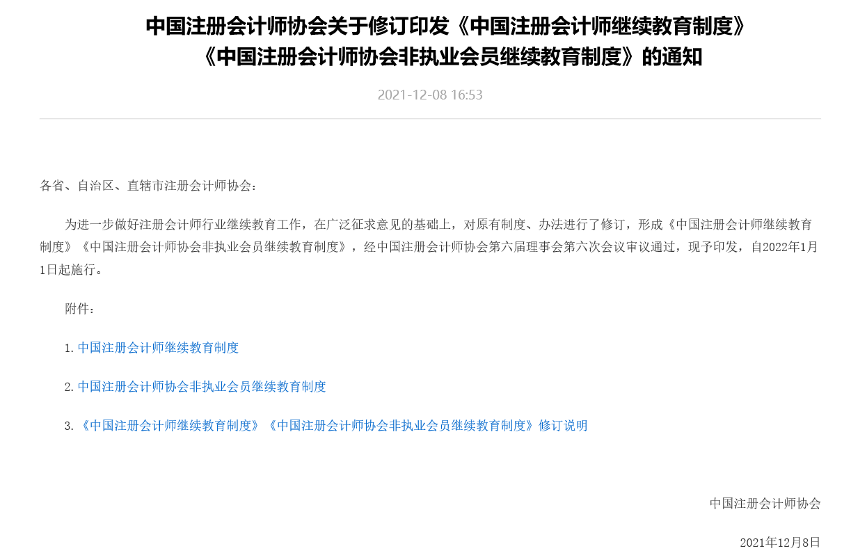在21年年底,中國注冊會計師協(xié)會就發(fā)布了關(guān)于修訂印發(fā)《中國注冊會計師繼續(xù)教育制度》《中國注冊會計師協(xié)會非執(zhí)業(yè)會員繼續(xù)教育制度》的通知,自2022年1月1日起施行。