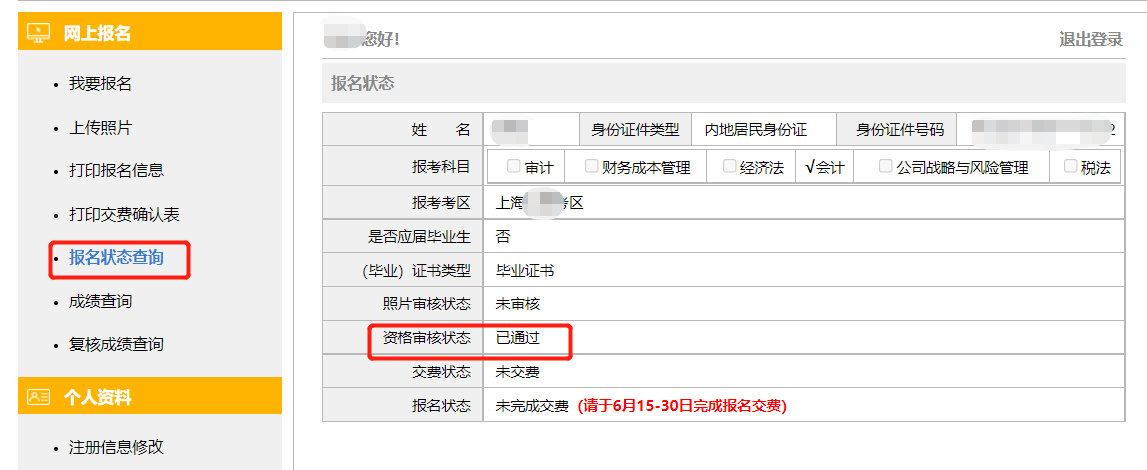 點擊報名系統(tǒng)左側菜單欄的【報名狀態(tài)查詢】,如果提示資格審核和照片審核都已通過,就說明現(xiàn)階段報名已經完成了!