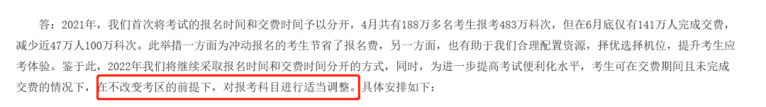很多同學對“適當調整”這個點不太理解,按照去年的規(guī)定,交費時只能在報名時選擇的科目上確定交費或不交費,但是無法增加或者替換科目。