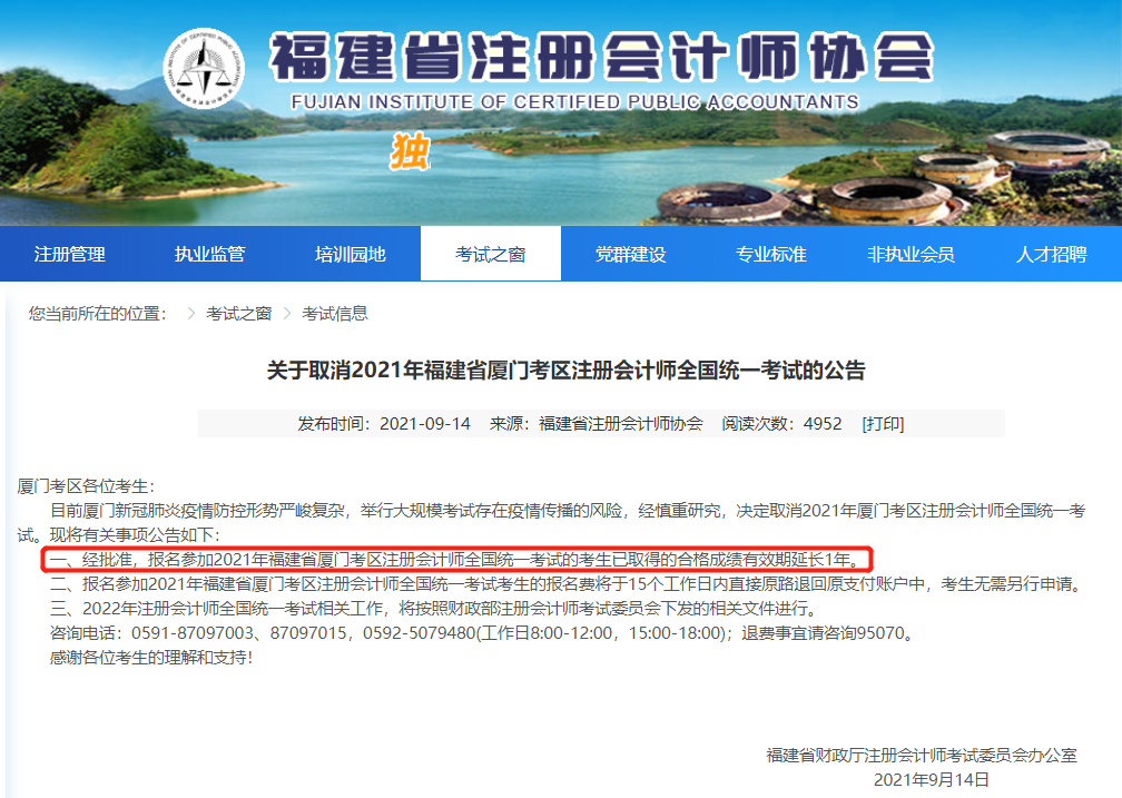 福建注協(xié)公告:(廈門(mén)考生)2021年已取得的合格成績(jī)有效期延長(zhǎng)一年!