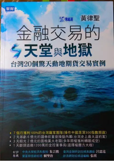7個月獲利100%的臺灣贏家團隊(操作中國滬深300指數(shù)期貨);3天賠光2億元的面板業(yè)大老板(多年期權(quán)獲利轉(zhuǎn)眼成空) ;1天斷頭追繳1200萬的金控董事長(期權(quán)賣方大咖) 。這一切真實交易案例都出現(xiàn)在了一本名為《金融交易的天堂與地獄:臺灣20個驚天動地期貨交易實例》的書里。