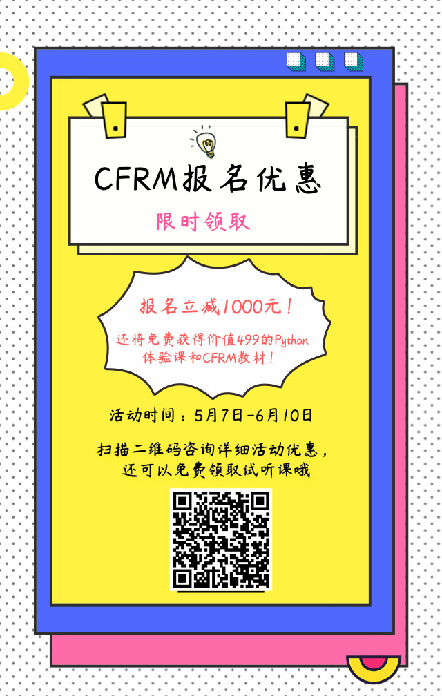 活動內(nèi)容:在截止日之前報名的學員,可以享受一千元的優(yōu)惠,還將獲得CFRM推薦教材和價值499的《Python量化投資與金融實戰(zhàn)引用(體驗課)》一份,體驗課可以自學或者轉(zhuǎn)贈,名額有限,先到先得!