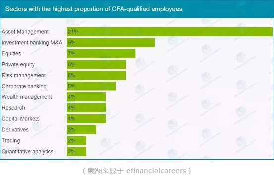 Asset Management 領(lǐng)域雇傭的 CFA 持證人占比較高,達(dá)到21%,遙遙領(lǐng)先;