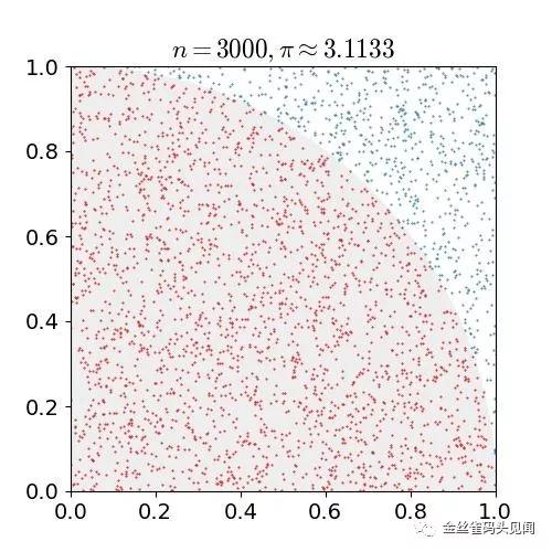 (小問題:為什么是這個公式?提示:單位正方形和四分之一圓面積關(guān)系)其中 N 是四分之一圓內(nèi)部的點數(shù),可以看到,除了計算沒有落入圓內(nèi)部的隨機點數(shù)外沒有任何其它操作,然后選一個比率來近似 π 的值。隨著模擬次數(shù)n的增多,模擬出來的圓周率π就會越精確。相信大數(shù)學(xué)家祖沖之知道有這么一個簡單的方法估算圓周率,他肯定會很興奮的吧!