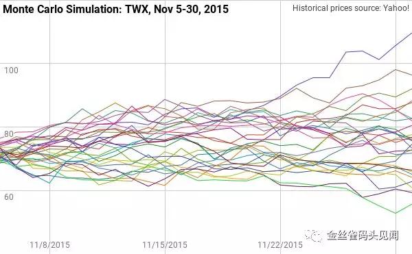 下面的一個實例,展示了2015年11月剩余時間的時代華納公司(TWX)股票的約30個預(yù)測軌跡: