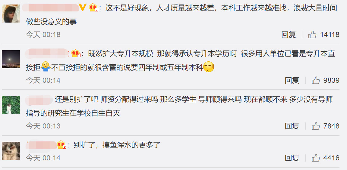 針對(duì)擴(kuò)招政策,網(wǎng)友紛紛表示出了擔(dān)憂,例如出現(xiàn)人才素質(zhì)下降、用人單位不認(rèn)可、師資分配不均等問(wèn)題。