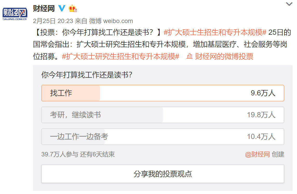 就今年的形勢(shì),擴(kuò)招研究生無(wú)疑是一個(gè)好的舉措,在一定程度上能夠緩解就業(yè)壓力。根據(jù)財(cái)經(jīng)網(wǎng)的調(diào)查顯示,確實(shí)有76%的參與者表示更加愿意繼續(xù)提升學(xué)歷水平,然后再選擇就業(yè)。