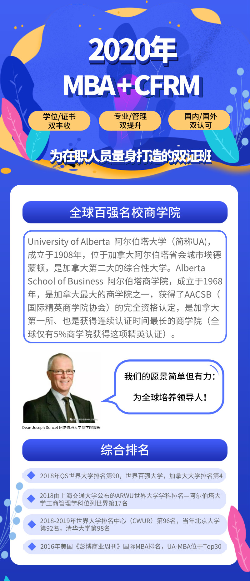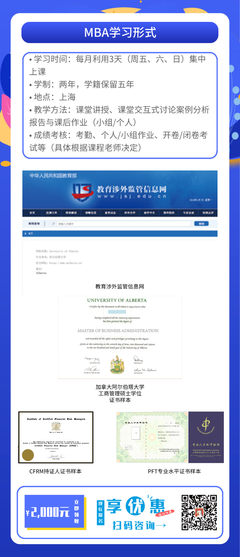 CFRM®認(rèn)證作為專業(yè)水平認(rèn)證,不具有學(xué)歷屬性。但對(duì)于持證人,可以選擇合作院校加拿大阿爾伯塔(世界排名90)大學(xué)商學(xué)院MBA班型,享受免面試、免考、優(yōu)先錄取等政策。
