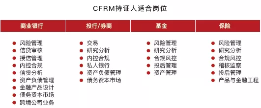 了解了金融專業(yè)考什么證書之后,那么CFRM證書面向人群也需要大致知曉,目前CFRM持證人主要分布在商業(yè)銀行、投資銀行、券商基金、保險機構(gòu)、咨詢服務(wù)、跨國企業(yè)等領(lǐng)域,具體可以看下圖,如果職業(yè)規(guī)劃和下圖中崗位重合,那么備考CFRM能夠為就業(yè)、求職加分。