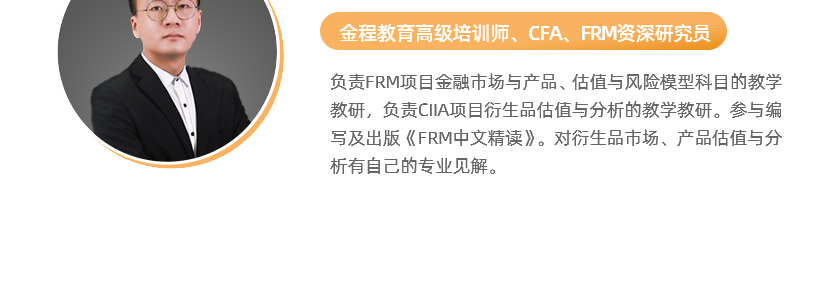 金程教育高級(jí)培訓(xùn)師,F(xiàn)RM、CIIA資深研究員。參與編寫及出版《FRM中文精讀》。對(duì)衍生品市場(chǎng)、產(chǎn)品估值有專業(yè)見解。