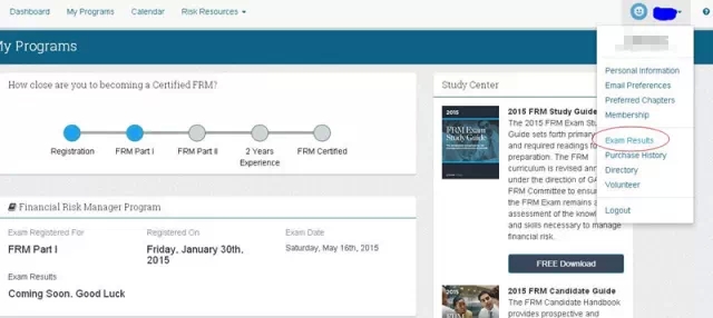 ②自助查詢:考生在GARP官網(wǎng)登陸自己賬戶后,在右上角點擊自己頭像,下面選項會有Exam Results,點擊進入即可查看成績。(見下圖,點擊大圖查看更清晰)