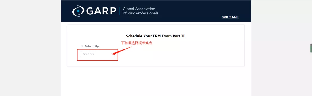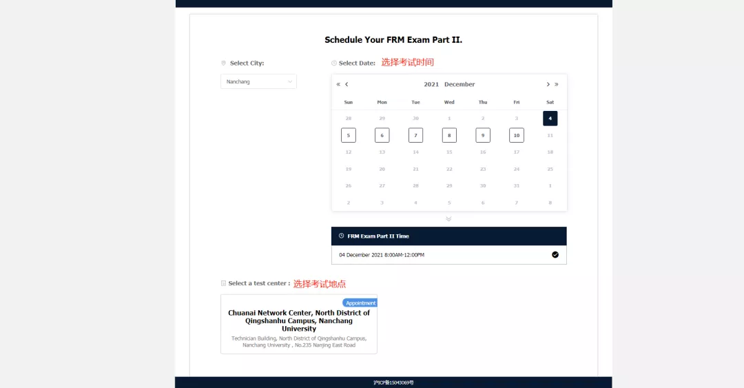 四、前往考試安排界面,進(jìn)行具體的2022年FRM考試地點(diǎn)選擇,報(bào)考報(bào)考地點(diǎn)、考試時(shí)間