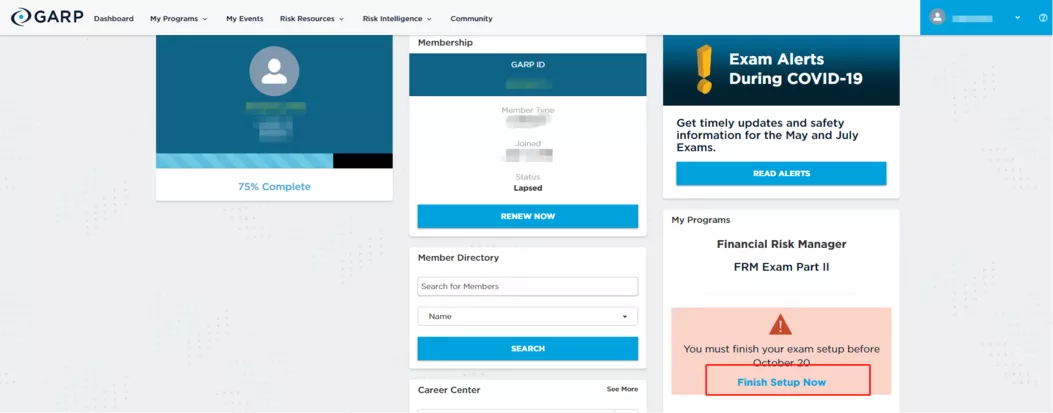 一、登錄GARP協(xié)會(huì),點(diǎn)擊 Finish Setup Now 進(jìn)行2022年FRM考試地點(diǎn)選擇下一步