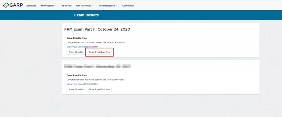 第三步:點擊查詢個人成績后進入如下頁面,點擊“download Quartiles”即可下載2022年FRM成績單。