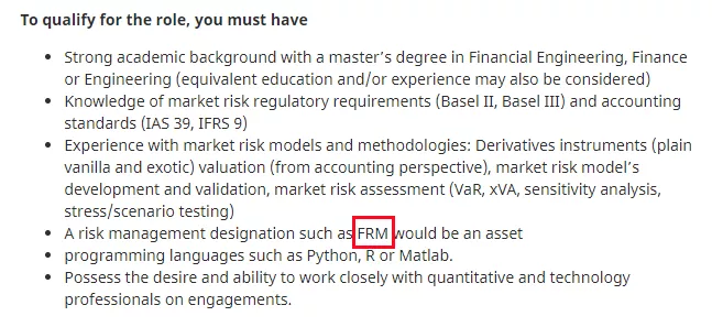 EY的Market Risk Consultant,要求候選人有風(fēng)險(xiǎn)管理相關(guān)資質(zhì),比如FRM證書(shū)。