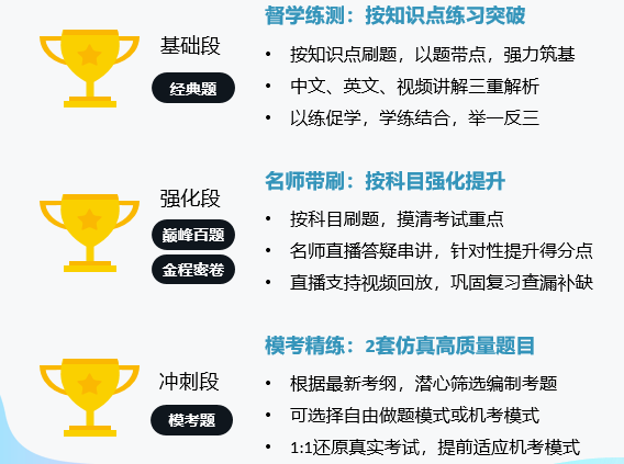 優(yōu)勢題目匠心篩選,三輪進(jìn)階刷題,在對的時(shí)間刷對的題,考試通過率曲線持續(xù)上揚(yáng)!