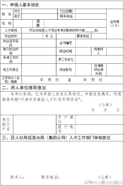 而且審報程序也不麻煩,填寫一份《天津市資格型人才引進專項資助申請表》,上傳至中國天津人力資源開發(fā)服務中心指定郵箱即可。