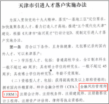 持有FRM證書的人才,在天津除了拿錢,還可以直接落戶!針對人才落戶,天津市還發(fā)布了《天津市引進人才落戶實施辦法》將人才落戶辦法提上了日程。 依據(jù)《天津市引進人才落戶實施辦法》,F(xiàn)RM持證人屬資格型人才,可直接落戶天津,沒有任何限制。