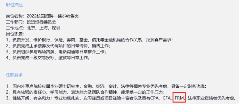 其中——債券銷售崗,就明確表示優(yōu)先考慮FRM、CPA、CFA持證人。