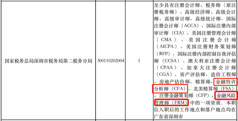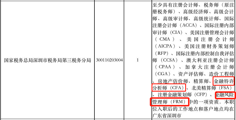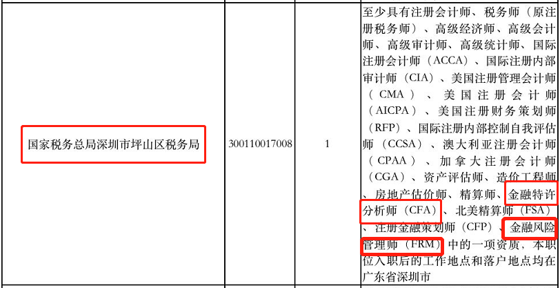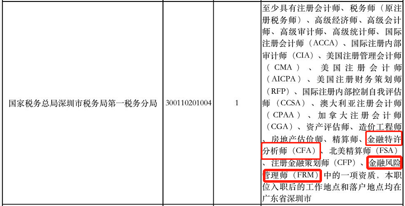參考《國家稅務(wù)總局深圳市稅務(wù)局補(bǔ)充錄用職位簡表》,發(fā)現(xiàn)其中不少都要求需要拿到FRM證書。