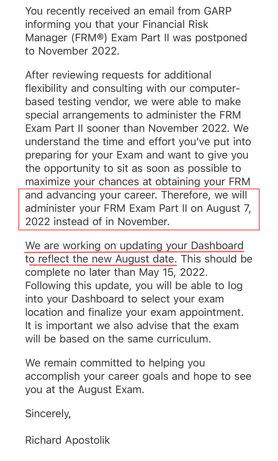 收到郵件,大家問(wèn)的最多的一個(gè)問(wèn)題就是:這郵件意思是強(qiáng)制改到8月,還是可以自由選擇啊,目前看是全部強(qiáng)制改到8月??赡艽蠹覍?duì)GARP協(xié)會(huì)不太熟悉,GARP協(xié)會(huì)和隔壁CFA協(xié)會(huì)風(fēng)格不同,從疫情開(kāi)始,但凡涉及到考試延期,他們都不會(huì)給考生選擇權(quán),全部都是一刀切統(tǒng)一延期到一個(gè)考期。