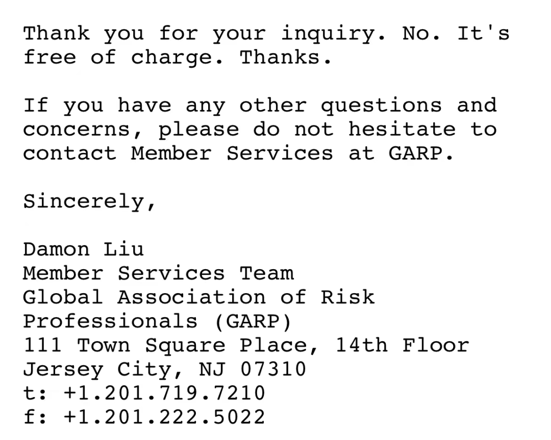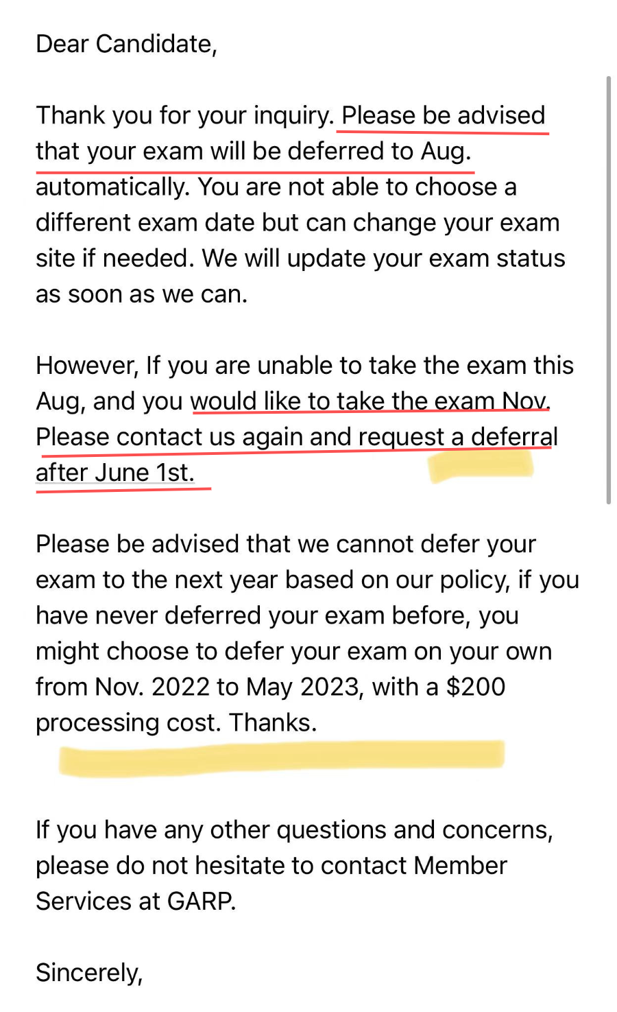 FRM協(xié)會(huì)是表示,考生假如無(wú)法參加8月的FRM考試,可以選擇參加11月場(chǎng)次,有這種需求的考生在6月1日之后給協(xié)會(huì)再次發(fā)郵件要求延期即可。一開(kāi)始的郵件并沒(méi)有明確是否免費(fèi)所以也有小伙伴去二次詢問(wèn),協(xié)會(huì)給到的回復(fù)是:延到11月是免費(fèi)的!