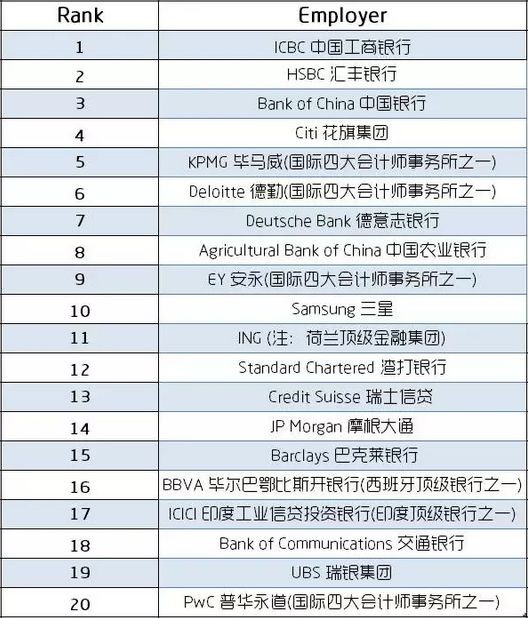 FRM全球前雇主TOP20主要由國際頂級的商業(yè)銀行、投資銀行、四大會計(jì)師事務(wù)所構(gòu)成。The top 20 companies employing the most Certified FRMs are: