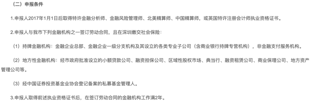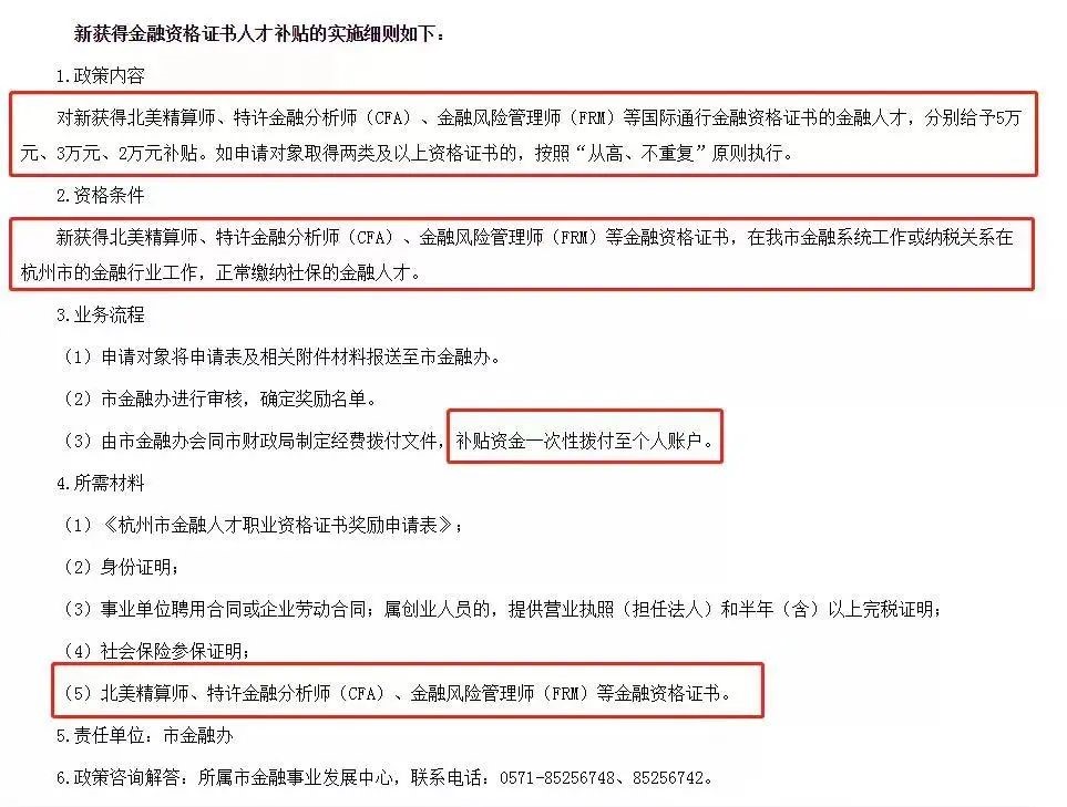 深圳福田正在尋找CFA持證人/FRM等金融人才,給予萬元補貼!政府規(guī)定,2017年1月1日后取得證書且在深圳市金融系統(tǒng)全職工作滿2年的,每個執(zhí)業(yè)資格證書給予1萬元獎勵補貼,且每人最高不超過5萬元。
