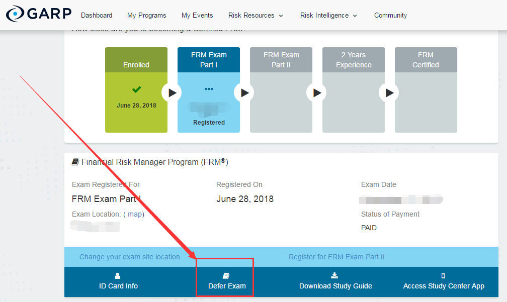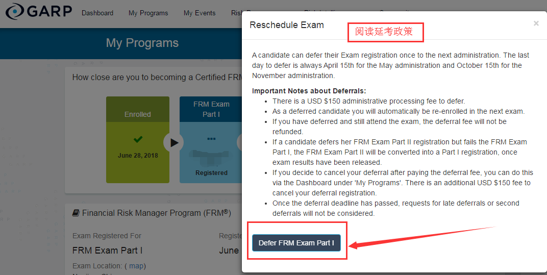 4、閱讀延考說明,點(diǎn)擊“Defer FRM Exam Part Ⅰ”