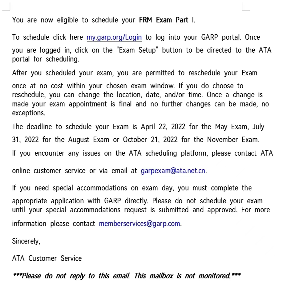 從郵件中我們可以看出,FRM一級(jí)部分是可以預(yù)約考位了,小伙伴們趕快登錄協(xié)會(huì)官網(wǎng)預(yù)約考位吧!