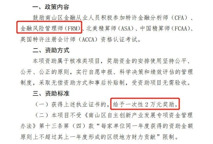 其中提到了,對2020年1月1日后取得金融風(fēng)險管理師(FRM)證書的持證者,給予一次性2萬元獎勵。