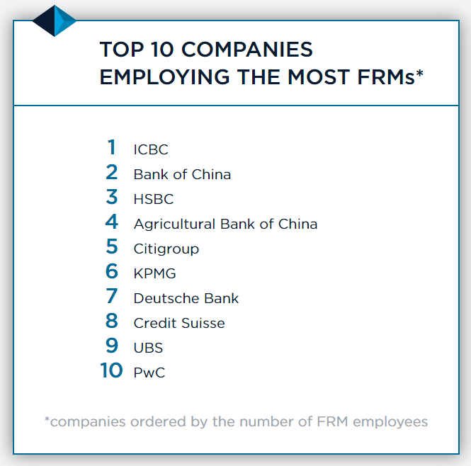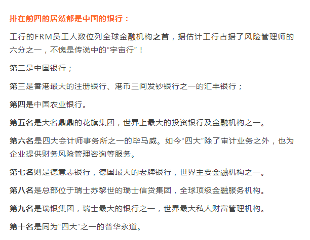 FRM工作選擇,前四依舊是中國的銀行,分別是工商銀行、建行、農(nóng)行以及中國銀行。匯豐銀行排在第七位。摩根大通位列第五,富國銀行第六,花旗集團(tuán)第八,美國銀行第九。西班牙的桑坦德集團(tuán)排在第十位。