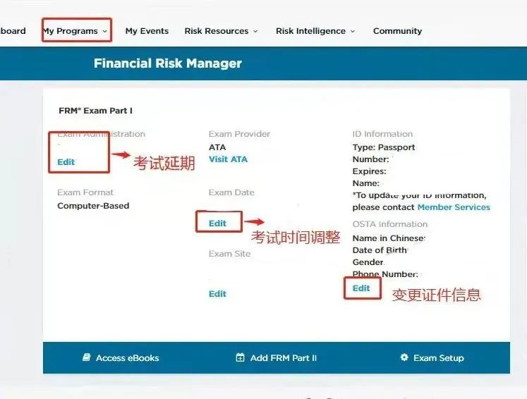 如果是護(hù)照?qǐng)?bào)名,重新申請(qǐng)護(hù)照是比較麻煩的,時(shí)間也比較久,所以在FRM報(bào)名前務(wù)必檢查好有效期,如果需要更新證件信息,同樣是在官網(wǎng)對(duì)應(yīng)位置進(jìn)行更改或者需要聯(lián)系協(xié)會(huì)郵件/電話進(jìn)行有效期更改。